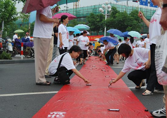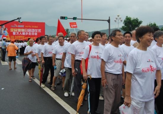 健步走隊伍在麗水市委書記陳榮高的帶領下,從濱水公園出發(fā),沿著花園路-囿山路-宇雷路-江濱路返回濱水公園,盡管活動開始后不久,天空就下起了小雨,但是這絲毫沒能阻擋大家的熱情,隊伍冒雨堅持走完了全程。到達終點后,大家在印有麗水市“全民健身日”暨萬人健步走活動的橫幅上簽字。