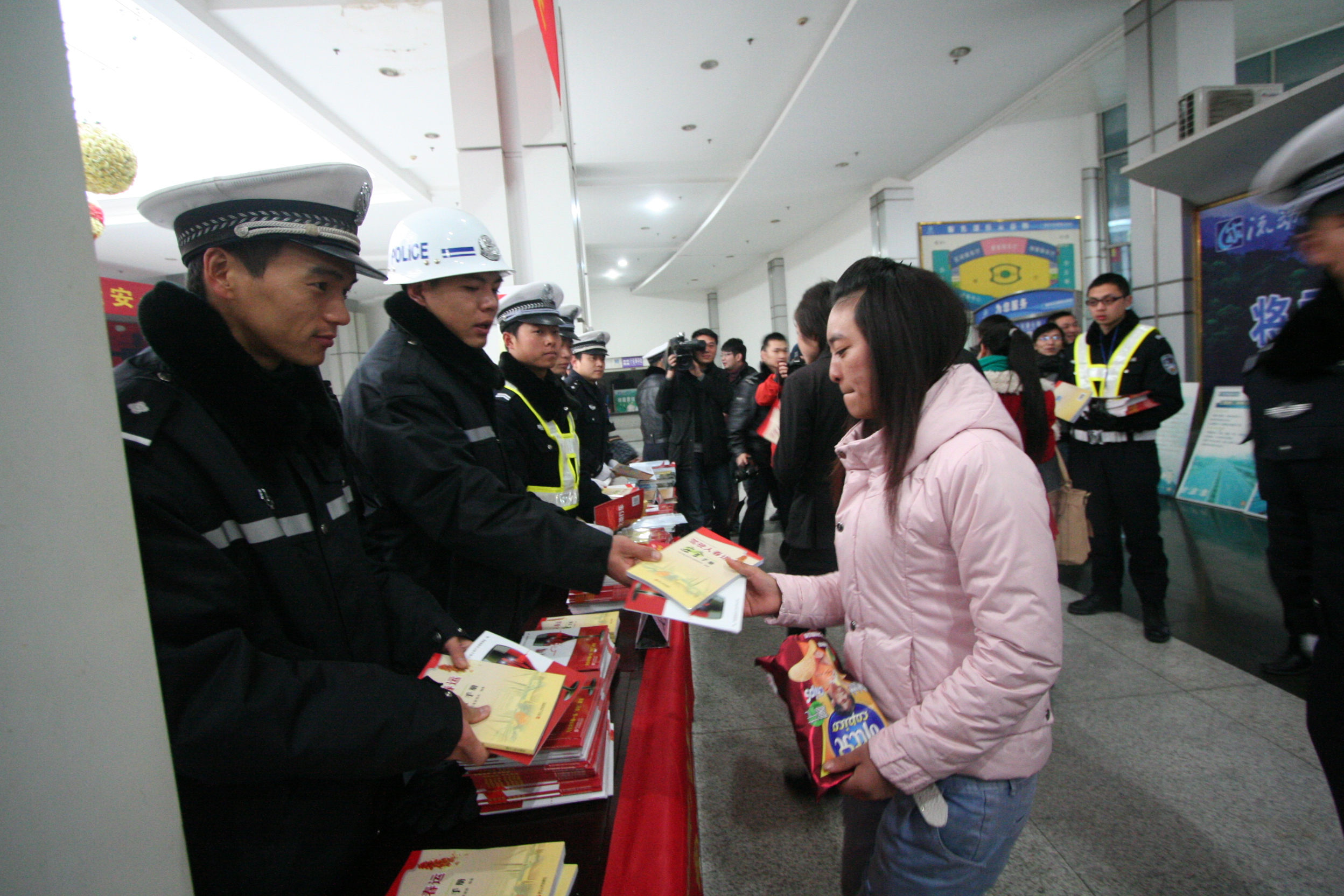 春運首日,麗水市交警支隊、高速交警麗水支隊、麗水市運管處、麗水交通音樂頻率四家單位聯(lián)合客運東、西站在兩站候車廳開展春運首日暨平安春運問計于民宣傳咨詢活動?;顒蝇F(xiàn)場,設立了交通安全宣傳窗,高速交警進行了調查問卷活動。四家單位除了通過派送春節(jié)禮包、新年掛歷、福字等形式送上新年祝福同時,還向旅客發(fā)放了《駕駛人春運安全手冊》、《珍愛生命 拒絕酒駕》、《平安出行 快樂駕車》、《新手上路必讀》等宣傳圖冊,向大家倡導“平安春運,人人有責”的理念。