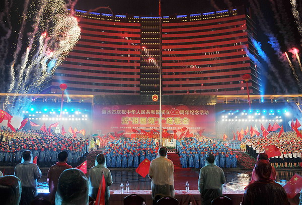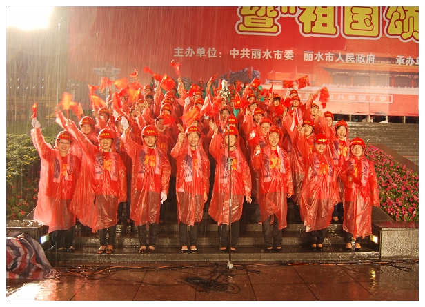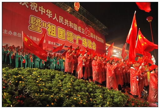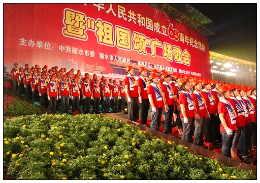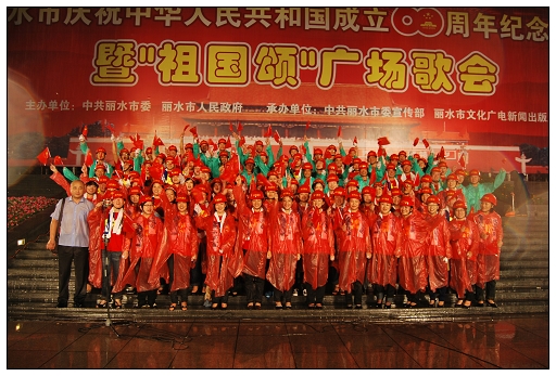 麗水市慶祝新中國成立60周年紀(jì)念活動暨“祖國頌”廣場歌會隆重舉行。歌會分革命英雄贊、建設(shè)新中國、走進新時代三個篇章進行。15個方陣依次進行大合唱,每個方陣各唱一首歌。