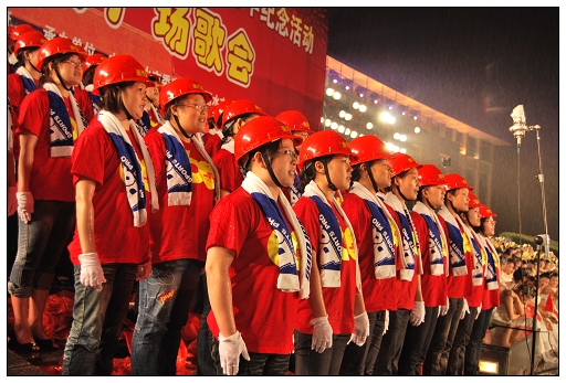 麗汽集團96位員工組成的合唱隊在雨中激情唱響《咱們工人有力量》。