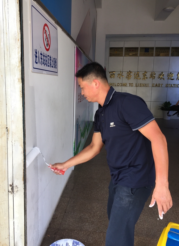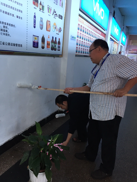 東站志愿者隊(duì)售票廳、候車(chē)廳、發(fā)車(chē)區(qū)墻壁進(jìn)行刷白