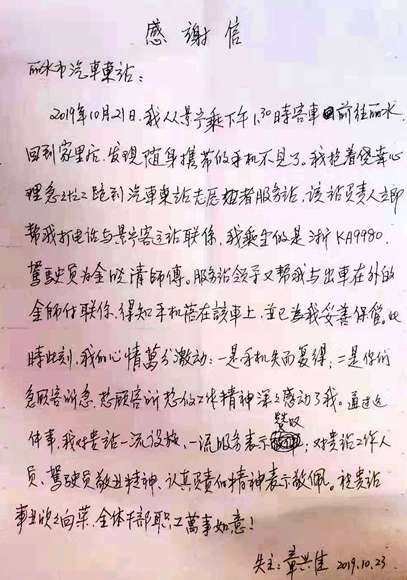 11月18日,東站服務(wù)臺(tái)收到了乘客章興佳親手送來的一封感謝信,這是一封寫給東站業(yè)務(wù)站站長鄭宣偉的感謝信,信中寫到失主章興佳于10月21日從景寧乘車到麗水,不慎將手機(jī)遺落在車上,在他發(fā)現(xiàn)手機(jī)不見后,抱著僥幸的心里來到服務(wù)臺(tái)尋求幫助時(shí),業(yè)務(wù)站站長鄭宣偉第一時(shí)間幫他聯(lián)系駕駛員尋找手機(jī)的事情。
