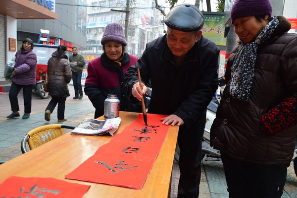 退休老黨員蘭延生、陳根松冒著嚴寒一大早來到了服務現(xiàn)場,在現(xiàn)場為市民們義務寫對聯(lián)、送對聯(lián),蘭老的字清秀大方,陳老的字遒勁有力,在一旁觀看的市民“嘖嘖”稱道,他們自覺排起了長隊,耐心等待著兩老的“墨寶”,成為“黨員服務一條街上”的一大亮點。