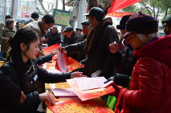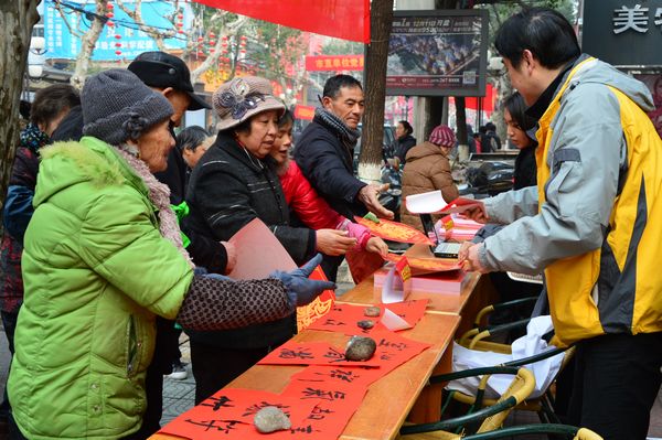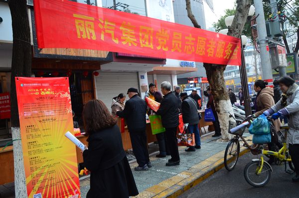 “貼上真正寫的春聯(lián),才有過年的味道”,一位排隊等候的姑娘對蘭老的字情有獨鐘。家住白云小區(qū)的齊大媽更是感慨自己已65歲,上還有90歲高齡母親,非要請?zhí)m老寫下:“今日正逢萱草壽,前身合是杏花仙”,橫披“九十大壽”對聯(lián),作為母親九十大壽的賀禮。拿到對聯(lián)后的齊大媽稱心滿意地說:“今天我非常高興、開心,你們這么冷的天為我們義務寫對聯(lián),抽出休息時間為人民服務,祝福你們麗汽集團生意越做越大?!?br/> 黨員們在中山街上頂著寒風,冒著嚴寒,不斷為市民們送福字,寫對聯(lián),送對聯(lián),把暖暖的祝福送給市民。據(jù)統(tǒng)計,集團公司黨員服務一條街,送出“福”字1500余張,送出對聯(lián)200余副,發(fā)放班車時刻表、旅游信息表等1000余張。