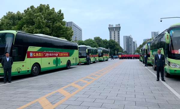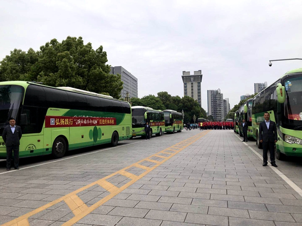 4月19日早上,在市政府南門廣場,麗汽集團(tuán)旅游汽車分公司16輛綠色豪華大巴齊刷刷地排列著,16位駕駛員統(tǒng)一著裝,整齊劃一地站在車門迎候游客。這是2019年麗水市弘揚(yáng)踐行“浙西南革命精神”系列活動啟動儀式暨勞模、一線(優(yōu)秀)職工紅色療休養(yǎng)活動發(fā)團(tuán)儀式的現(xiàn)場。綠色大巴與著紅色服裝的先進(jìn)相互映襯,形成了“紅+綠”融合發(fā)展的場景,和諧的畫面吸引了在場人員的關(guān)注,紛紛拿出手機(jī)拍場景,曬朋友圈。