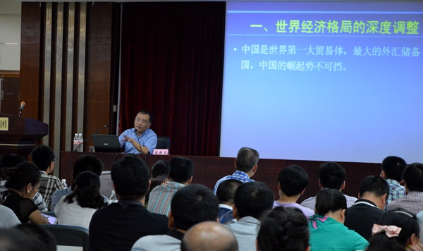 在上課過程中,陳敬東教授圍繞世界經(jīng)濟格局的深度調(diào)整、中國經(jīng)濟的換檔期和陣痛期、大膽創(chuàng)新落實改革意圖、中國經(jīng)濟的發(fā)展趨勢分析及新形勢下企業(yè)如何應對挑戰(zhàn)等五個方面對當前宏觀經(jīng)濟形勢進行了分析講解。在企業(yè)如何應挑戰(zhàn)中,陳教授指出:在當前形勢下,企業(yè)應從培育新的意識、找準新的定位、制定新的戰(zhàn)略、開發(fā)新的產(chǎn)品和服務、建立新的品牌等方面進行努力,迎接新一輪挑戰(zhàn)。