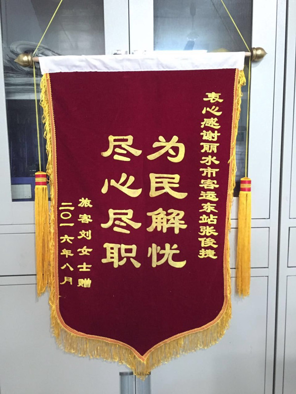 8月20日上午,一位女士將一面錦旗送到客運(yùn)東站站長(zhǎng)值班室,握著值班站長(zhǎng)的手一個(gè)勁地道謝。錦旗上赫然寫著:“盡心盡職,為民解憂”八個(gè)醒目的大字,感謝麗水客運(yùn)東站張俊捷。