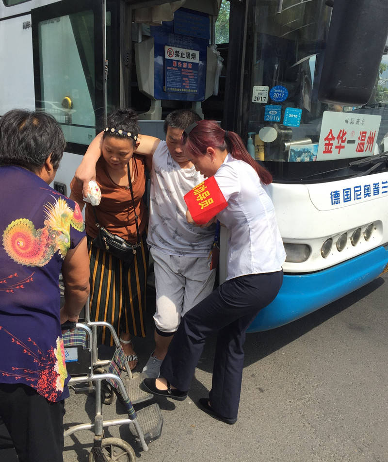 9:35金華到麗水的班車緩緩地駛進(jìn)了高鐵配載點。車一停穩(wěn),旅客們便陸陸續(xù)續(xù)的下車前往下一個目的地。眼尖的江旭紅看見一位中年婦女在車門處很吃力的拉著什么,江旭紅心想,車上可能有行動不便的旅客需要下車。江旭紅全然不顧烈日的暴曬,毫不猶豫的迎上前去。果不其然,車門處的阿姨和車上的另一個阿姨正連拉帶抱的幫一位行動不便的大叔下車。大叔看上去50多歲的樣子,因為得了某種疾病一點都不會做自主的動作,全憑兩位阿姨慢慢地挪動,160多斤的體重給兩位阿姨扶他下車增加了不少的難度。才移下一個臺階,汗珠已經(jīng)順著兩位阿姨的臉頰往下淌。江旭紅立即從行李倉拿出他們隨車攜帶的輪椅撐開,放在車門旁。由于車子臺階處較窄,站不下其他的人,江旭紅就在車下位置幫著把大叔的腳抬起來,待大叔被移到最后一級臺階時,江旭紅順勢托起大叔的一只手,和車上那位阿姨一起,使盡渾身力氣一步一步慢慢地把大叔架到了輪椅上。接著江旭紅又把大叔送到陰涼處,等待家人來接。這時的江旭紅已是滿頭大汗,背上的衣服都濕透了。